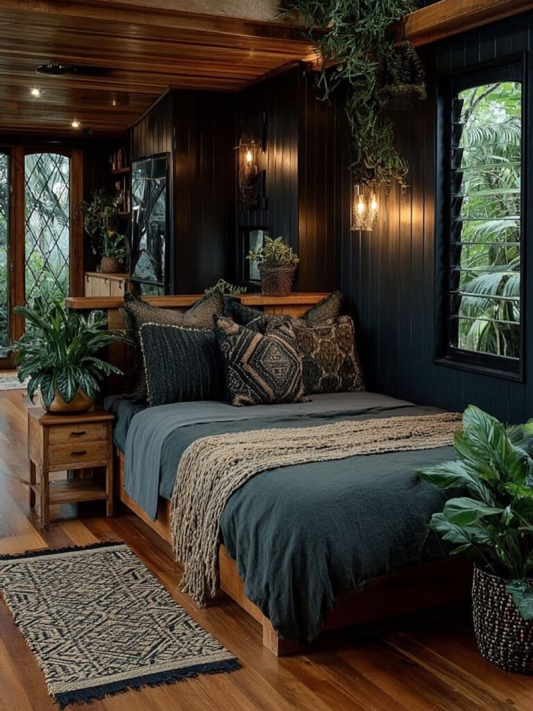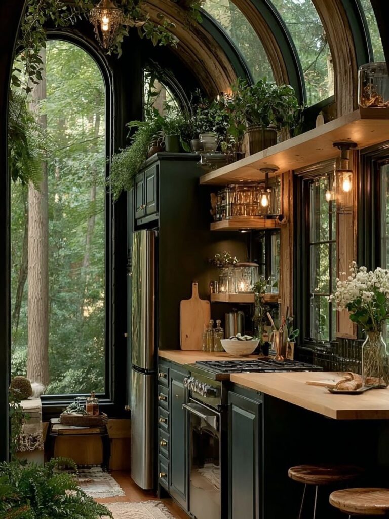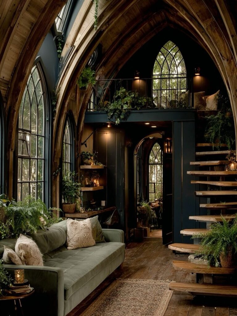 Nestled deep within a lush, emerald forest, this enchanting tiny house looks as though it stepped straight out of a fairytale. Draped in ivy and soft moss, its arched windows and sloping roof blend seamlessly with nature, creating a serene sanctuary far from the noise of modern life. The dark exterior contrasts beautifully with the vibrant greenery, making the warm glow inside even more inviting as it spills softly through the tall gothic-style windows.