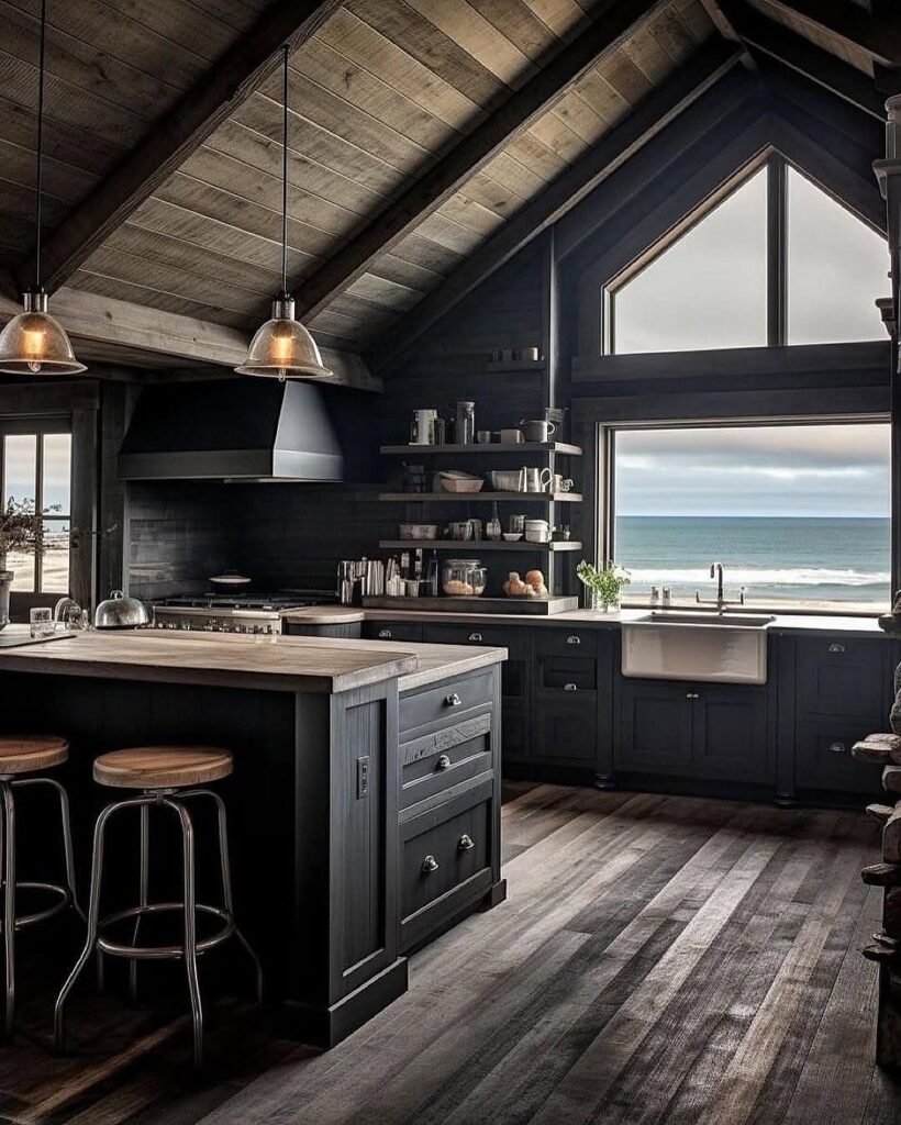 Nestled along a rugged shoreline, this dark coastal cottage stands like a quiet guardian facing the sea. Its charcoal-hued exterior and steep gabled roof create a striking contrast against the pale sky and rolling ocean waves. The symmetry of its structure, combined with large windows that invite light from every angle, exudes both strength and serenity. Even from afar, the warm glow from inside hints at comfort within, a sanctuary from the ocean’s chill.