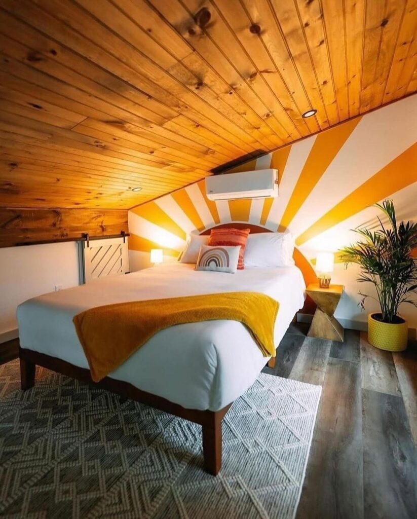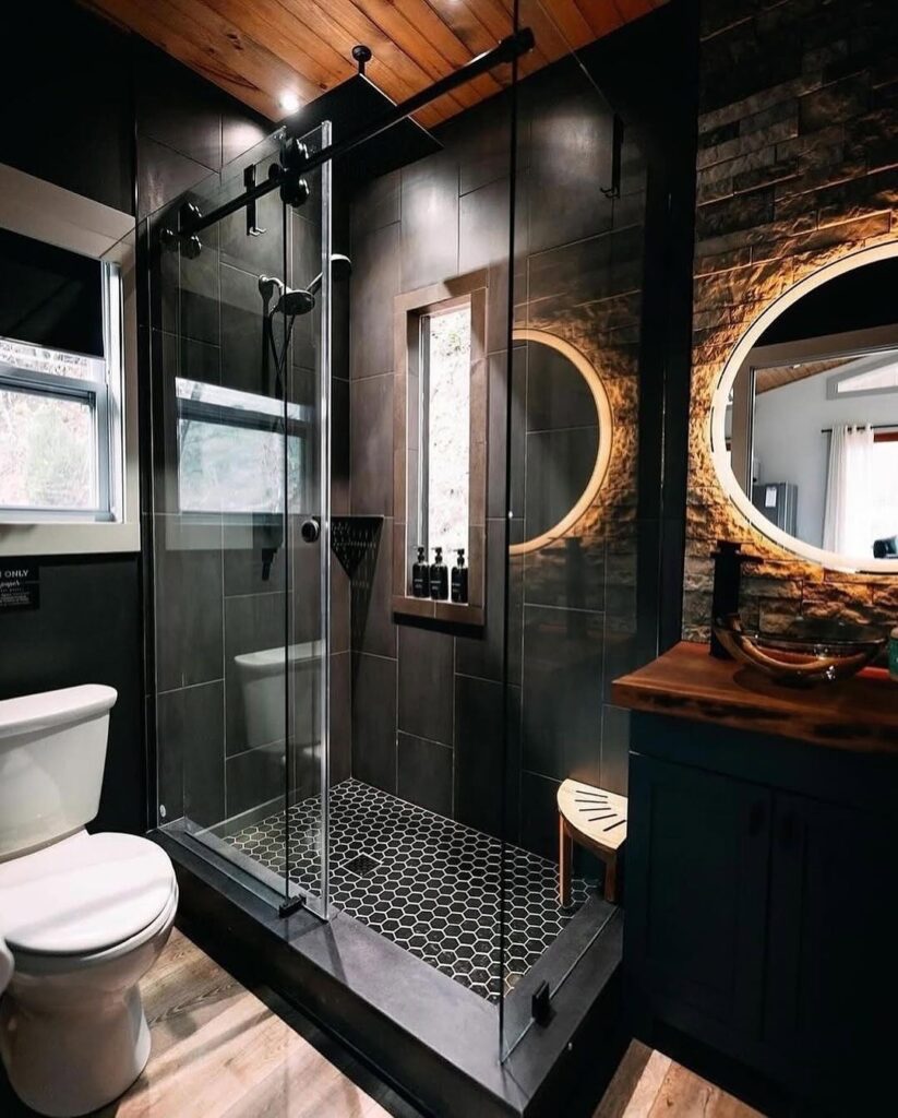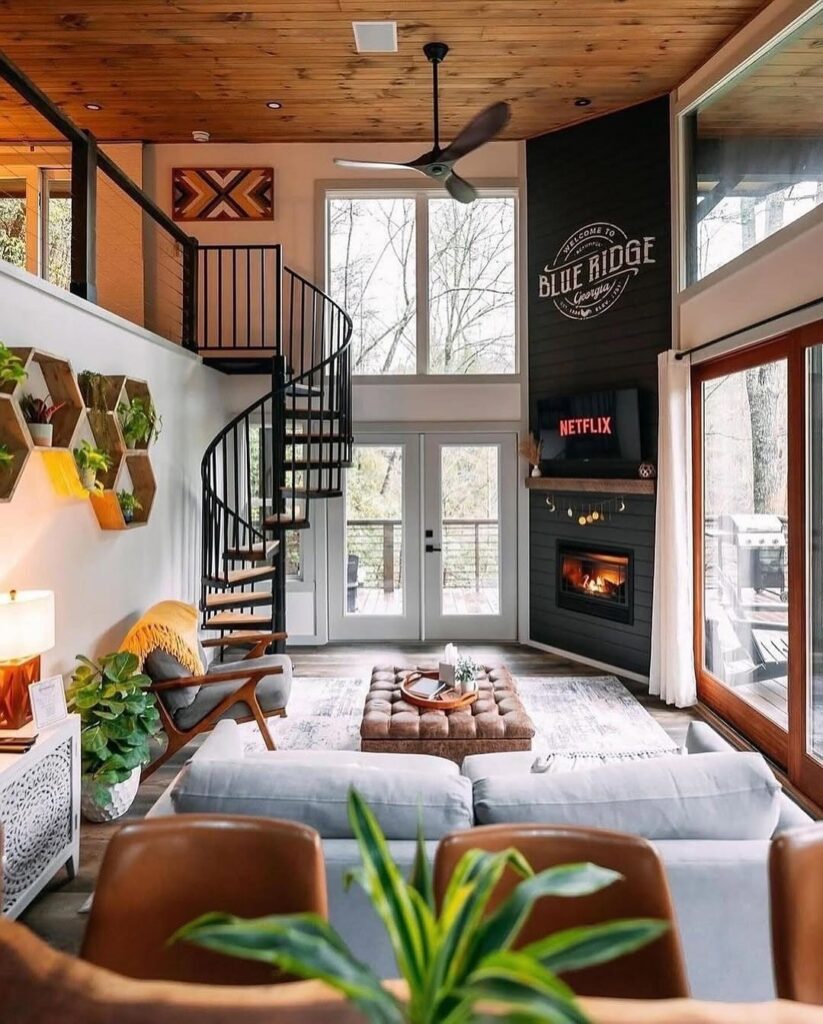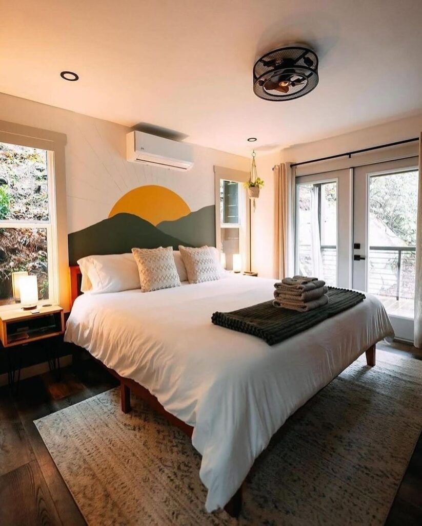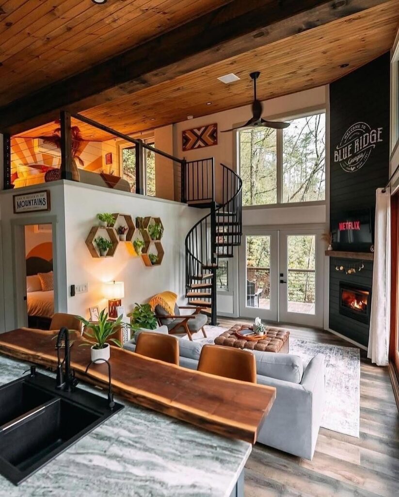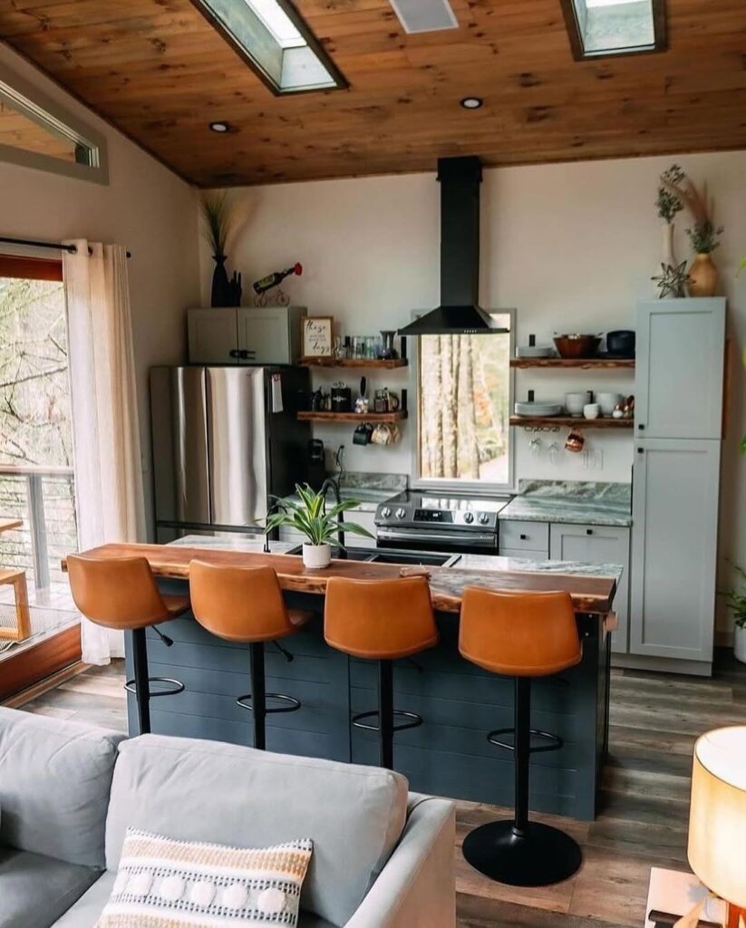 The wraparound deck offers an uninterrupted view of the forest, giving guests space to breathe, relax, and feel suspended between earth and sky. Whether sipping coffee at sunrise or watching the last golden light fade behind the trees, the serenity of this spot is undeniable. The glass doors connect the indoors to the outdoors, allowing nature to be part of every moment spent inside the cabin.