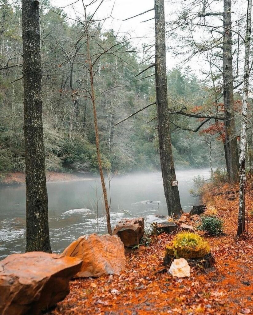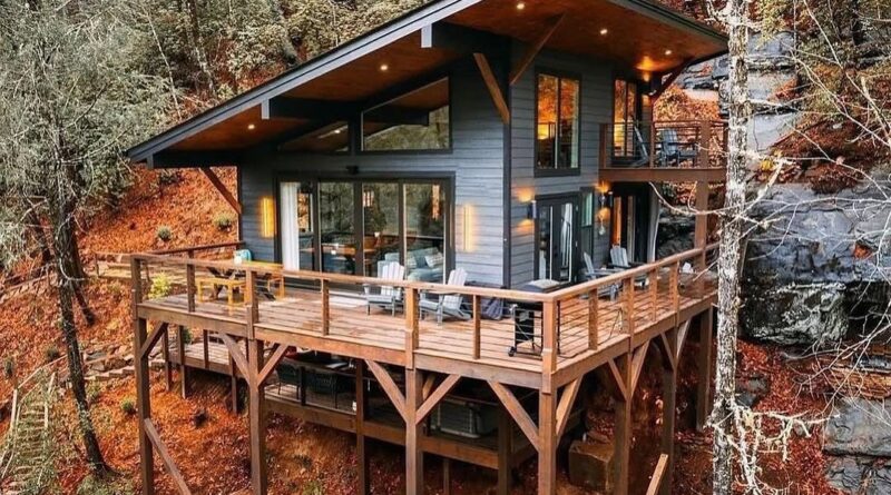 Perched gracefully on the edge of a steep forested hill, this stunning cabin looks as though it’s floating above a sea of autumn leaves. Supported by tall wooden beams and stone pillars, it rises confidently from the rugged terrain, embracing the beauty of nature while showcasing remarkable architectural design. The slanted roof, expansive windows, and warm lighting create a welcoming contrast to the cool tones of the surrounding wilderness