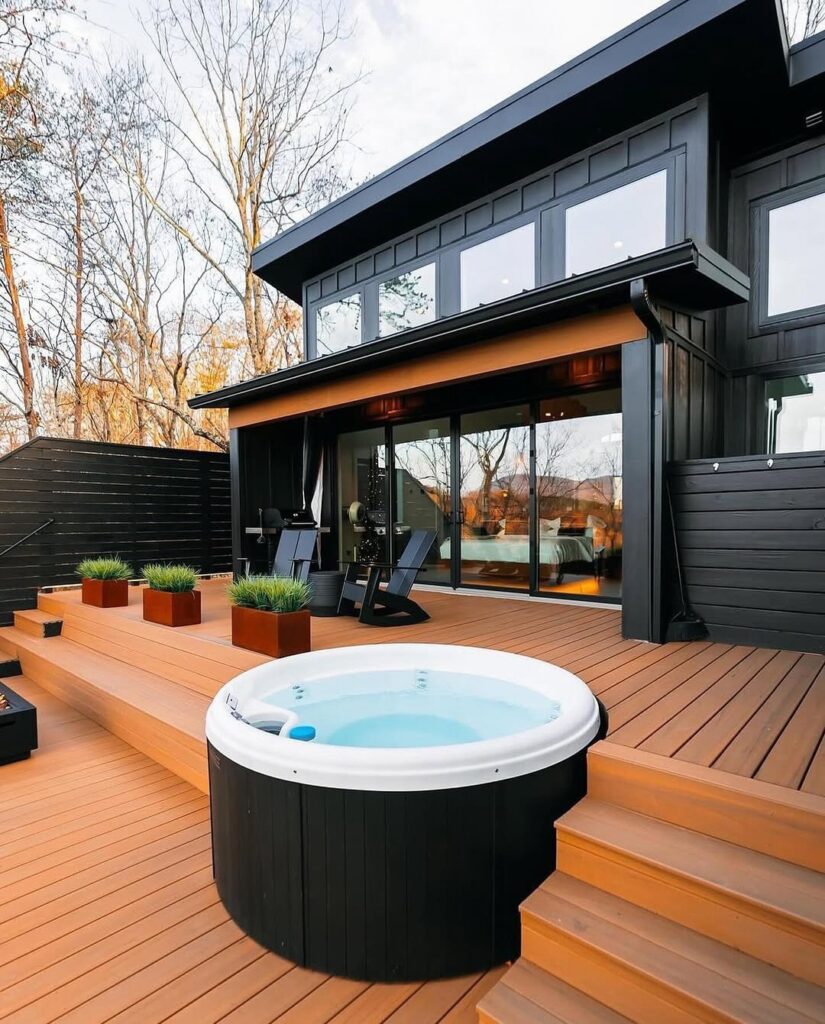 The spacious deck is the heart of this getaway—a place where mornings begin with coffee by the railing and evenings end in the warm glow of sunset. Whether lounging in the rocking chairs, gathered around the fire pit, or unwinding in the hot tub, every moment on this terrace is accompanied by breathtaking views of the distant mountains and forest valley below. It’s the perfect spot to breathe in the fresh air and let time slow down.