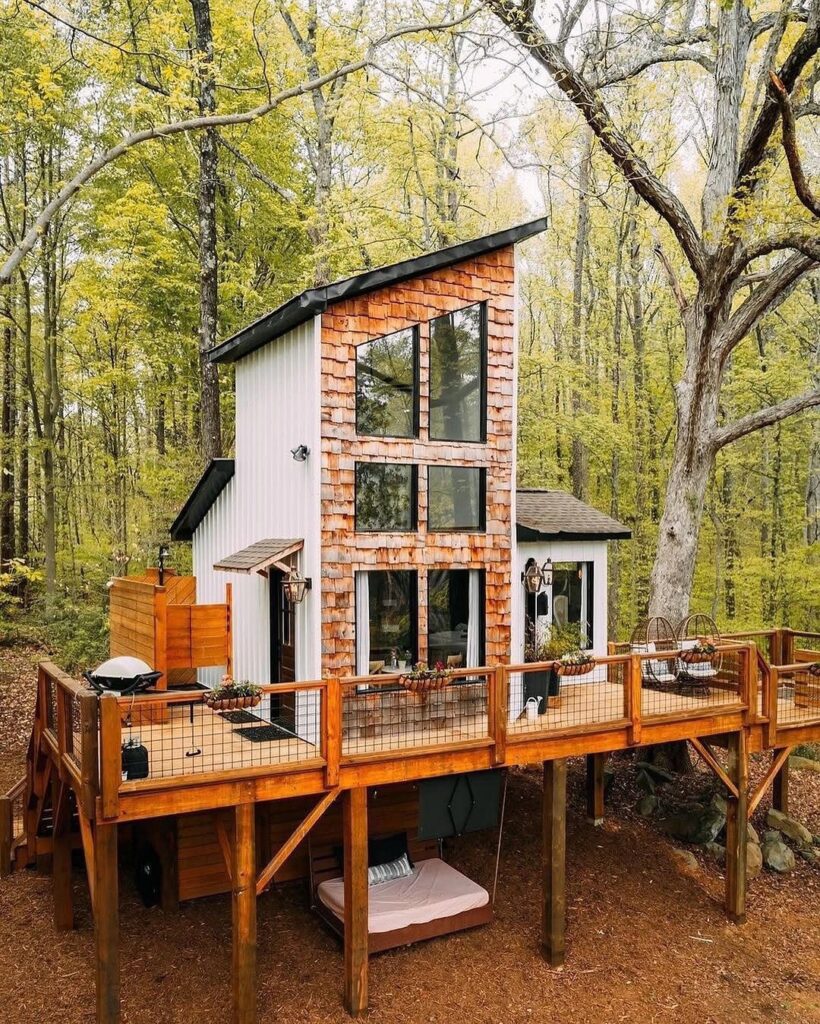 Nestled among towering trees and bathed in golden sunlight, this enchanting treehouse-style cabin offers a perfect blend of comfort and adventure. Elevated above the forest floor, it feels like a sanctuary suspended in nature. Its modern design—complete with large windows, warm wood tones, and cozy outdoor seating—invites you to slow down and breathe in the tranquility of the woods.