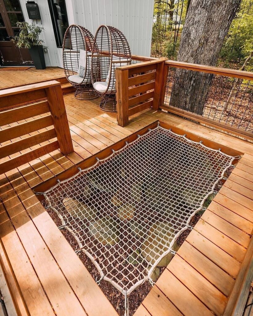 The spacious deck wraps around the cabin, creating an inviting space for relaxation and connection. Whether you’re lounging in the hanging chairs, sipping morning coffee, or reading a book under the canopy of leaves, every corner feels like a retreat for the soul. As sunlight filters through the trees, the warm glow enhances the natural beauty of the surroundings, making the cabin feel both magical and grounded.