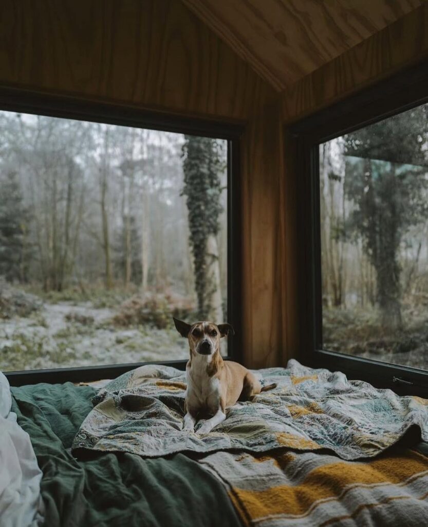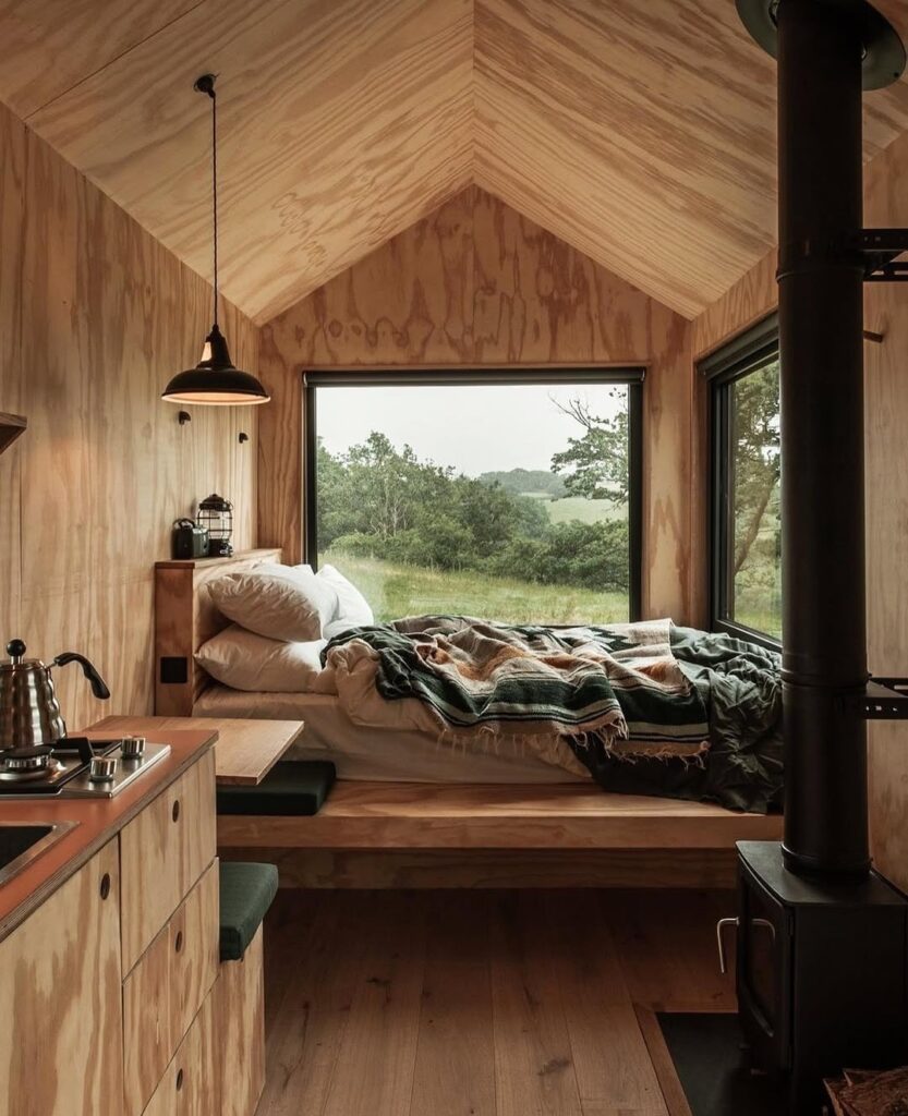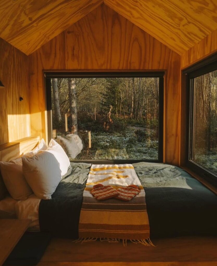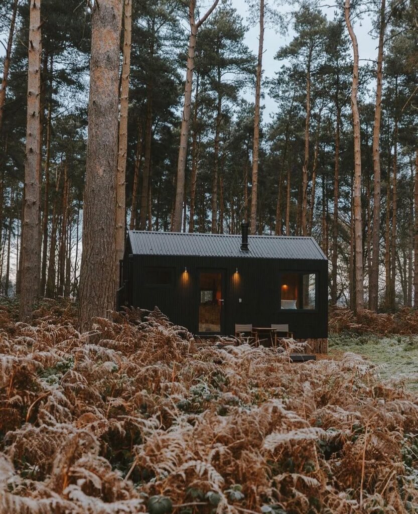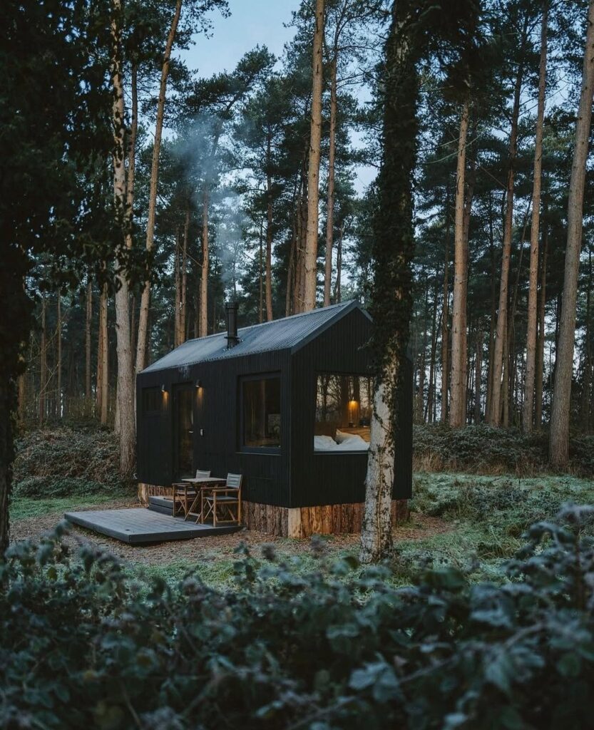 This cabin nails the atmosphere you wish most tiny homes had. It’s compact, sure, but nothing about it feels small. The clean black exterior, paired with oversized windows glowing like a fireplace at dusk, instantly tells you this place wasn’t built for mediocrity. It’s the kind of home that stands alone in a field and still looks like it owns the entire valley.