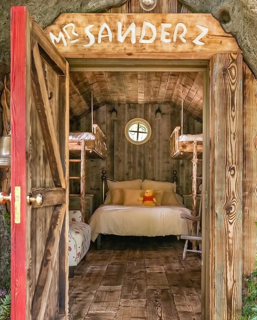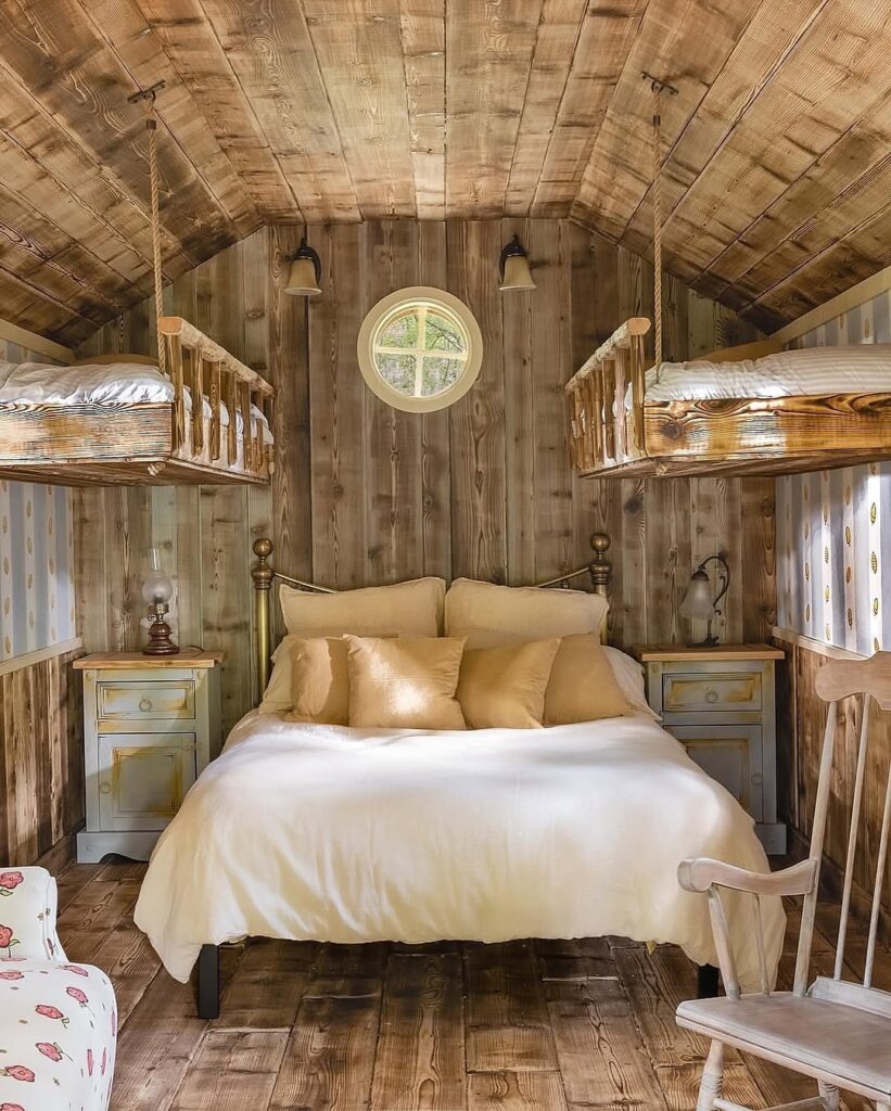 Step inside this enchanting woodland retreat, and it immediately feels like stepping into the pages of a beloved storybook. Warm wood tones, hanging loft beds, and soft golden lighting create a cozy, whimsical atmosphere that blends rustic comfort with childlike wonder. Every corner feels thoughtfully crafted, as if designed for quiet mornings, peaceful afternoons, and dream-filled nights.