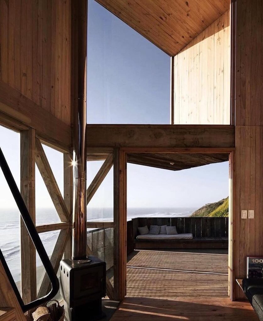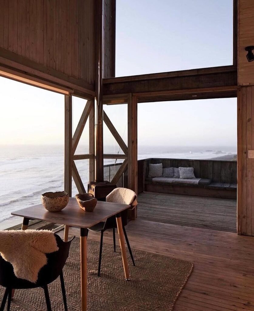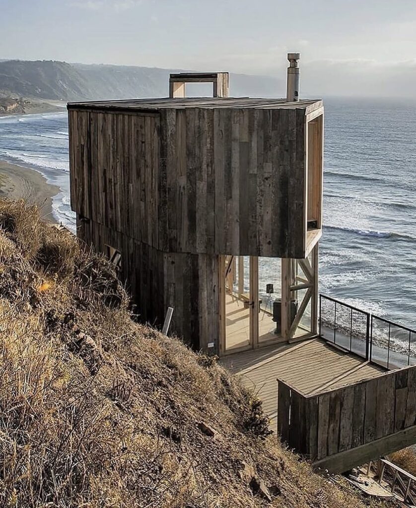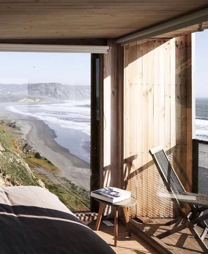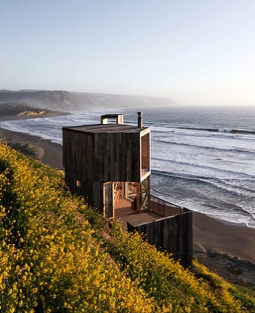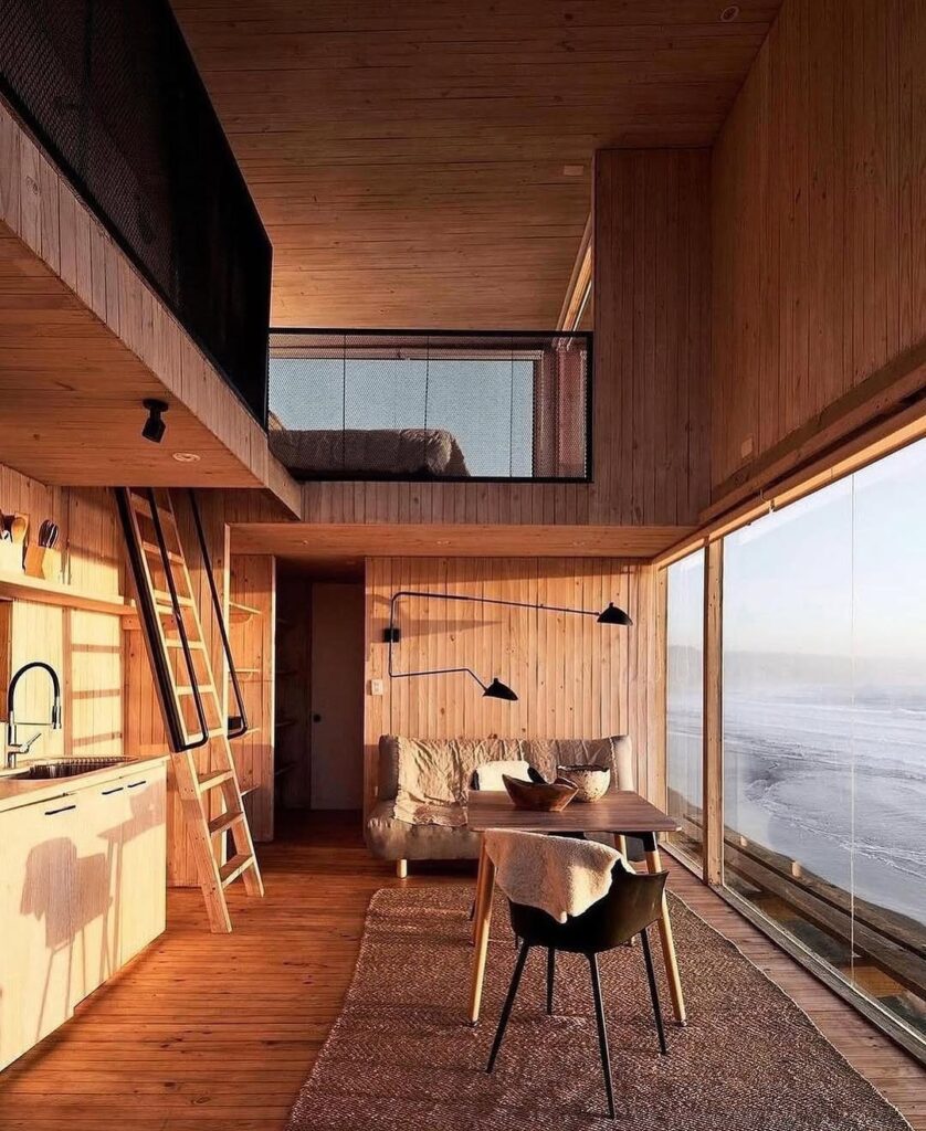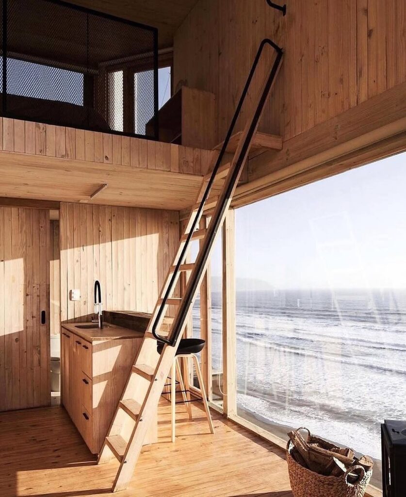 From its large picture window, one can almost imagine the sweeping view that greets anyone inside—endless waves rolling toward a deserted shore, the horizon fading gently into evening mist. The positioning of the cabin makes it feel like a lookout point for dreamers, offering a rare vantage where land, sea, and sky meet in quiet harmony. Its minimal design amplifies the beauty of the outside world, encouraging reflection and stillness.
