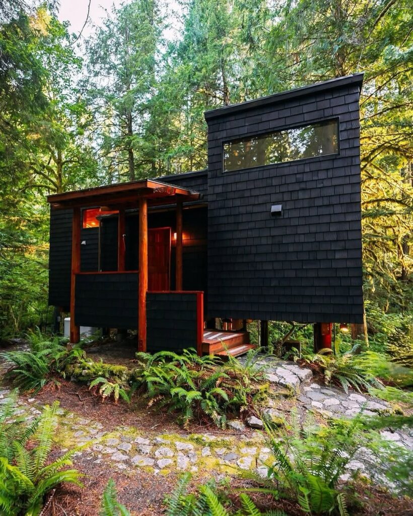 This cabin doesn’t bother trying to impress anyone with flashy angles or oversized windows. It plays a smarter game—using dark shingle siding and clean, modern lines to blend straight into the forest, like it was grown here instead of built. The structure stands on slim supports, lifting it just enough to hover above the ferns while keeping a low visual profile. It’s subtle, intentional, and honestly one of the few tiny homes that actually understands its environment instead of fighting it.