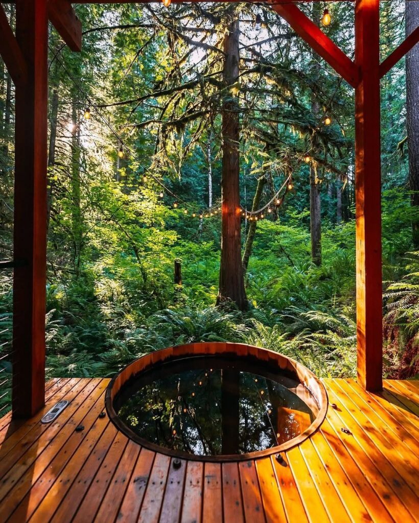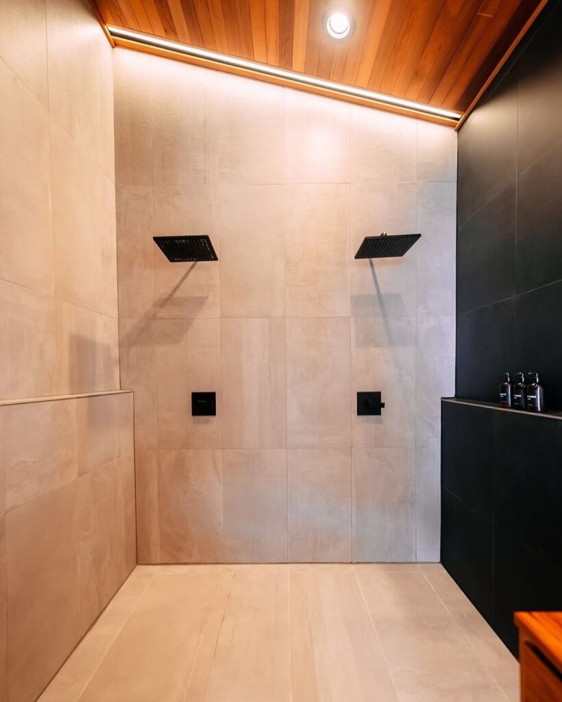 The stone path leading up isn’t some polished Pinterest walkway; it’s raw, uneven, and honest. That’s exactly why it works. Everything about the entry says you’re stepping into a place where nature is the main character, not the décor. The contrast between the warm, wood-toned porch and the deep black exterior creates a sharp, confident entrance—no frills, no fake rustic nonsense.