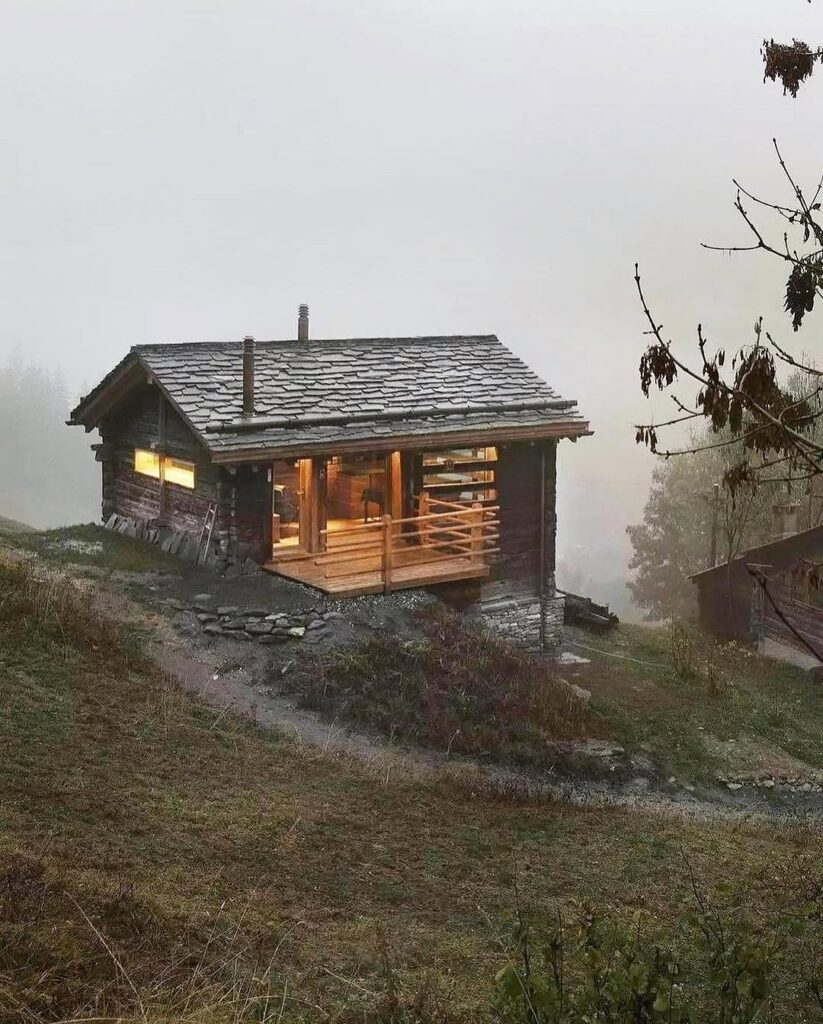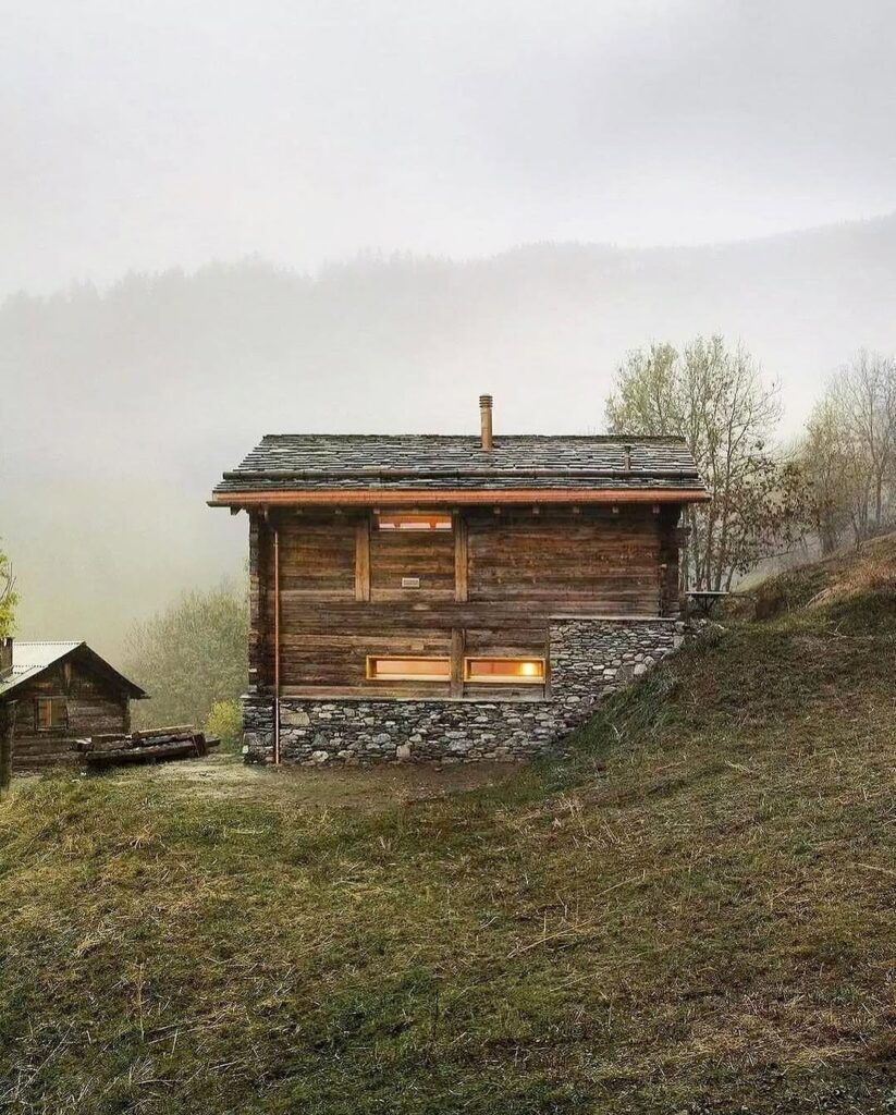The stone foundation is the unsung hero here. It anchors the entire cabin to the land, giving it the kind of stability most modern homes only dream about. The wood above it carries that same raw honesty—no polish, no fake finishes, just real material doing real work against the elements. Those warm lights spilling through the slatted walls aren’t just aesthetics; they make the place feel alive in the mist. The contrast between the glowing interior and the cold, fog-drenched forest gives the cabin a pulse. It’s the kind of glow that almost dares you to step inside.