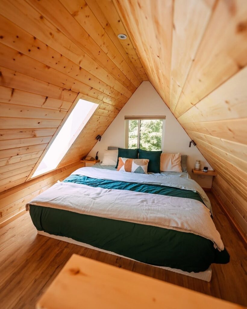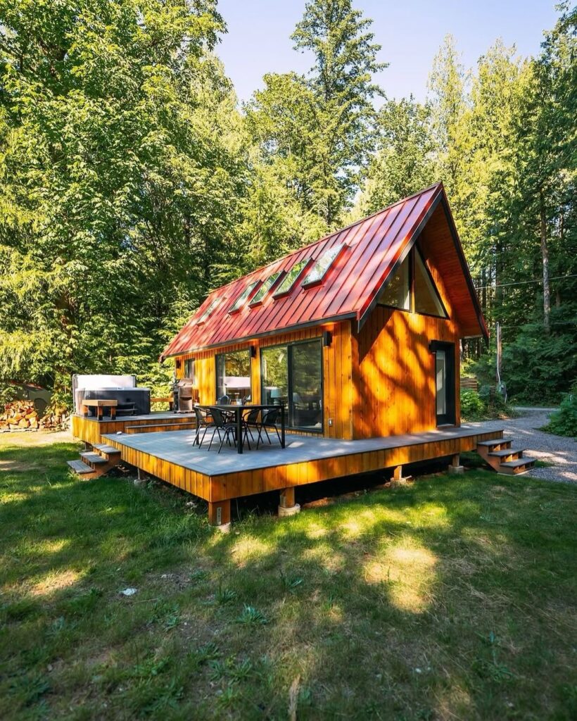 This cabin doesn’t play around. It’s a clean, sharp A-frame-inspired structure dropped right in the middle of a forest that looks almost staged. The cedar siding catches the sunlight like it’s showing off, and the dark trim gives it just enough edge to avoid looking like every other cookie-cutter micro-cabin you see on Instagram.