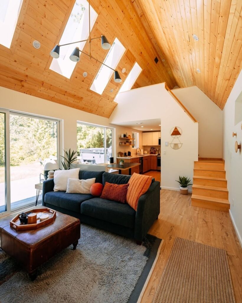 The roofline is doing a lot of heavy lifting here. The steep angle, paired with that upper window span, pulls in light like a magnet. It tells you one thing immediately: the inside is brighter than you’d expect for a compact footprint. If you’re trying to capture a modern cabin feel without going full luxury-lodge, this is the formula.