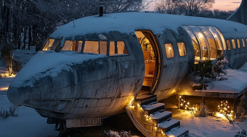 At first glance, it looks like a forgotten aircraft resting quietly in the snow. But step a little closer and something surprising happens — warm lights glow through the windows, inviting you inside. What was once a machine built to cross the skies has been transformed into one of the most creative tiny homes imaginable.