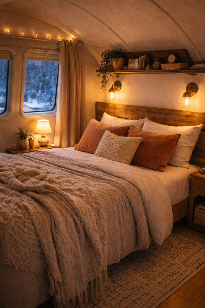 At the back of the cabin, the bedroom transforms the aircraft into a peaceful retreat. A soft bed sits against a wooden headboard, layered with warm blankets and textured pillows. The lighting here is intentionally gentle — soft bedside lamps and warm wall lights create an atmosphere that instantly relaxes you. Above the bed, a simple shelf holds books, plants, and small decorative pieces, adding personality without overcrowding the compact space. Outside the window, snow-covered trees create a quiet winter scene, making the bedroom feel like a hidden sanctuary in the forest.
