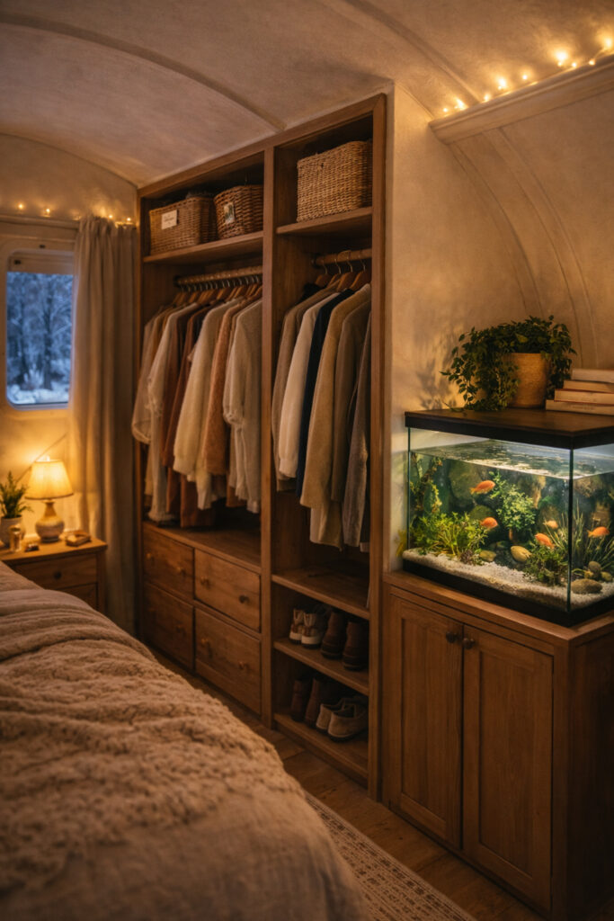Tiny homes thrive on clever storage solutions, and this airplane home does it beautifully. Built-in wooden wardrobes provide organized storage for clothing, while drawers and shelves maximize every inch of space. But what truly makes this area special is the unexpected detail beside the wardrobe — a small aquarium. The gentle movement of fish and water adds life to the space, bringing a peaceful natural element into the cabin. Combined with the warm lighting and wooden textures, the closet area feels more like a cozy corner than simple storage.