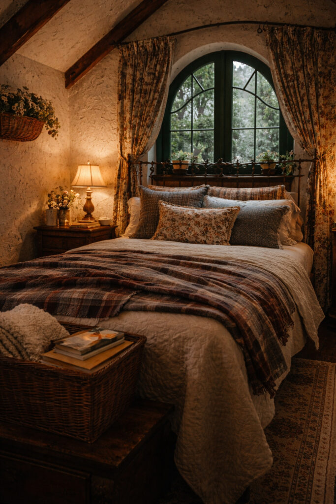 The bedroom continues the cottage’s theme of warmth and simplicity. Positioned beneath the sloping roof, the room feels private and intimate. A large bed sits directly beneath an elegant arched window framed by soft patterned curtains. From here, you can wake up to views of the surrounding trees and gentle forest light filtering through the branches. The bedding layers soft textures — warm blankets, decorative pillows, and natural fabrics — creating a restful sanctuary after a long day outdoors. Simple wooden furniture, woven baskets, and small plants add to the room’s cozy character while keeping the space uncluttered and peaceful.