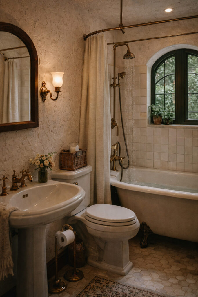 Even the bathroom reflects the cottage’s classic aesthetic. A freestanding bathtub sits beneath another arched window, offering the perfect place for a relaxing soak while enjoying views of the greenery outside. Brass fixtures, soft lighting, and textured plaster walls give the room a timeless feel. A simple pedestal sink and vintage-style mirror complete the design, balancing practicality with elegance. Despite the small footprint, the space feels comfortable and thoughtfully arranged, proving that even tiny bathrooms can feel luxurious with the right design choices.