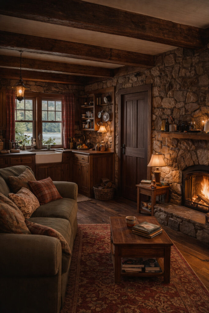 Step inside, and the entire mood flips. Rough stone walls. Heavy wooden beams. Soft, golden light bouncing off every surface. The fireplace isn’t decoration—it’s survival, comfort, and atmosphere all at once. The living space is tight, but intentional:
