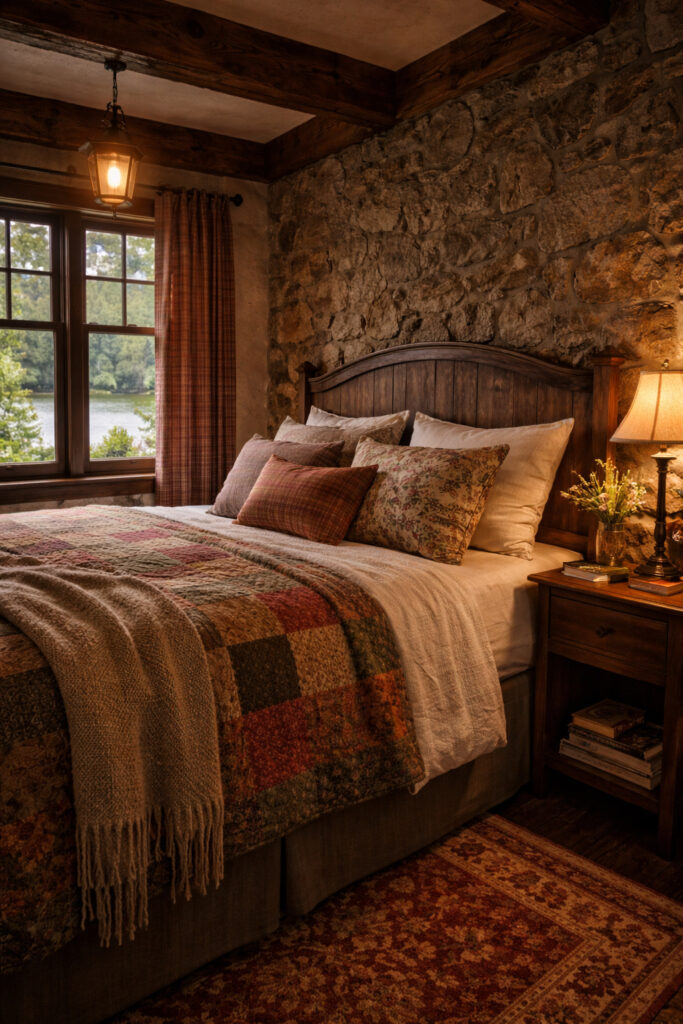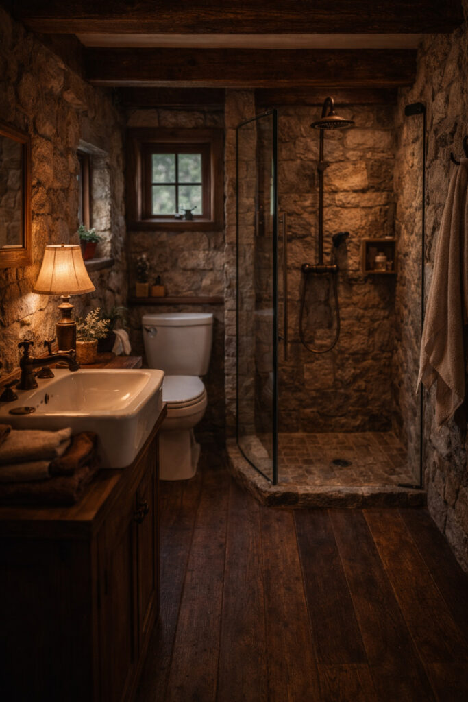 No marble. No modern nonsense. Stone, wood, warm lighting, and a simple walk-in shower. It feels like it belongs to the house, not added later to impress Instagram. That consistency? That’s what most creators miss.