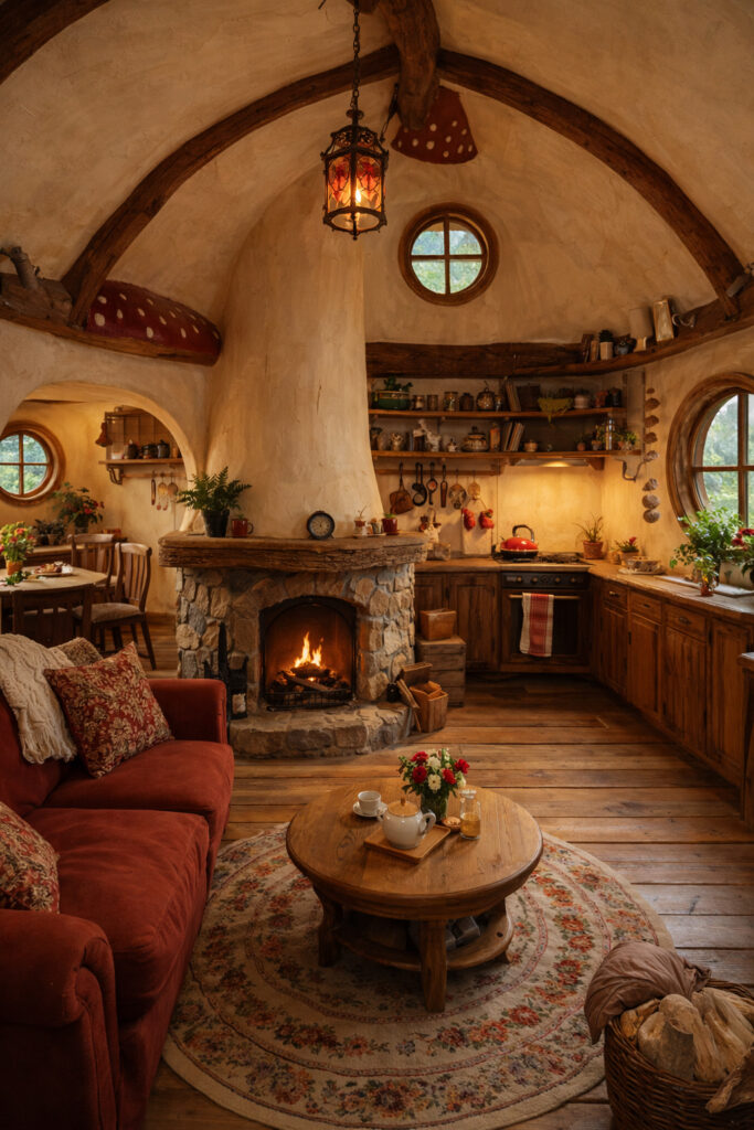 Tucked gently into lush greenery, this extraordinary mushroom-shaped home feels like it has been lifted straight out of a storybook and placed into the real world. Its curved structure, soft plastered walls, and iconic red, dotted roof create a visual identity that is both playful and deeply comforting. Unlike conventional homes that rely on rigid lines and predictable geometry, this design embraces organic forms, making the entire structure feel alive and naturally integrated into its surroundings. The exterior immediately sets the tone for what lies within. A winding stone pathway leads up to a rounded wooden door, framed by carefully arranged potted flowers that add bursts of color and warmth. The circular windows, positioned thoughtfully across the façade, not only enhance the whimsical aesthetic but also soften the overall appearance of the house. Everything about the exterior invites curiosity, hinting that this is more than just a home—it is an experience. Stepping inside, the magic continues. The interior is a seamless blend of rustic craftsmanship and cozy functionality, where every detail feels intentional. The living area flows effortlessly into the kitchen, unified by warm wooden textures and soft, ambient lighting. A central stone fireplace anchors the space, radiating warmth both physically and visually. Above, exposed wooden beams follow the natural curve of the ceiling, reinforcing the organic design language established outside.