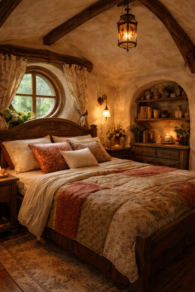 The bedroom continues this narrative of comfort and intimacy. With its softly curved walls and low, arched ceiling, the space feels protective and serene. A wooden bed dressed in layered textiles and earthy tones becomes the focal point, while warm lighting from bedside lamps and candles enhances the tranquil mood. The round window, framed by delicate curtains, acts as both a design feature and a connection to the outside world, allowing nature to remain a constant presence.