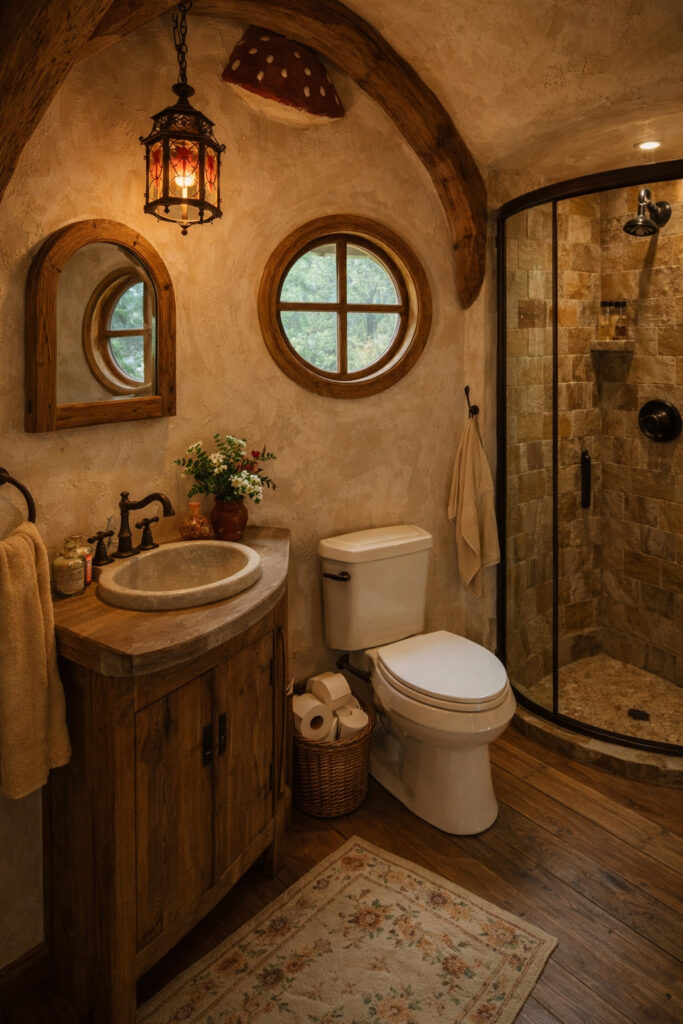 Even the bathroom reflects the same level of thoughtful design. Despite its compact size, it feels complete and inviting. A wooden vanity paired with a stone sink introduces texture and authenticity, while the glass-enclosed shower brings a modern touch without disrupting the rustic harmony. Soft lighting and natural materials ensure the space remains cohesive with the rest of the home, proving that functionality does not have to come at the expense of beauty.