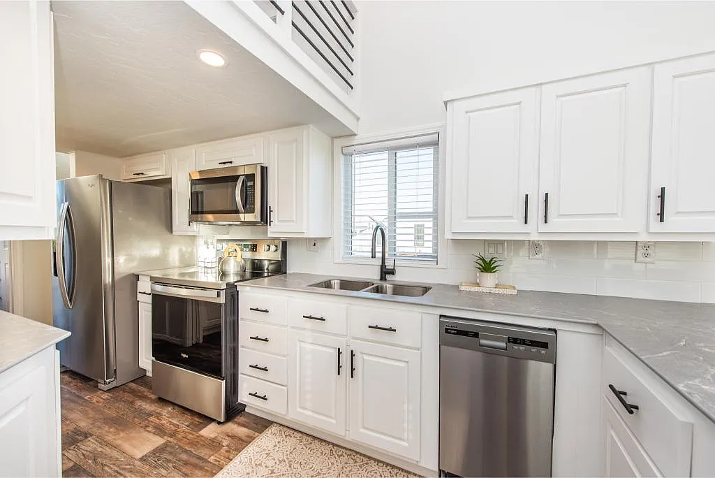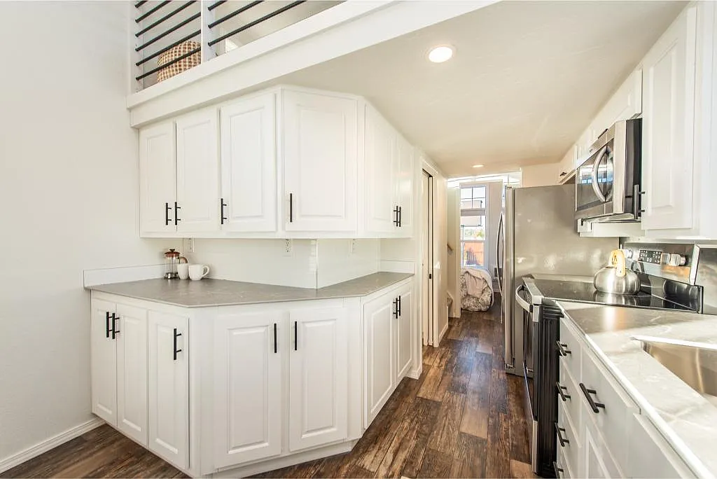 The kitchen is clean, modern, and fully functional, with plenty of cabinetry and workspace that makes everyday living effortless. It flows naturally into the living area, where large windows flood the space with natural light, making it feel far bigger than it actually is. What really stands out is the balance—nothing feels overcrowded, yet nothing is missing.
